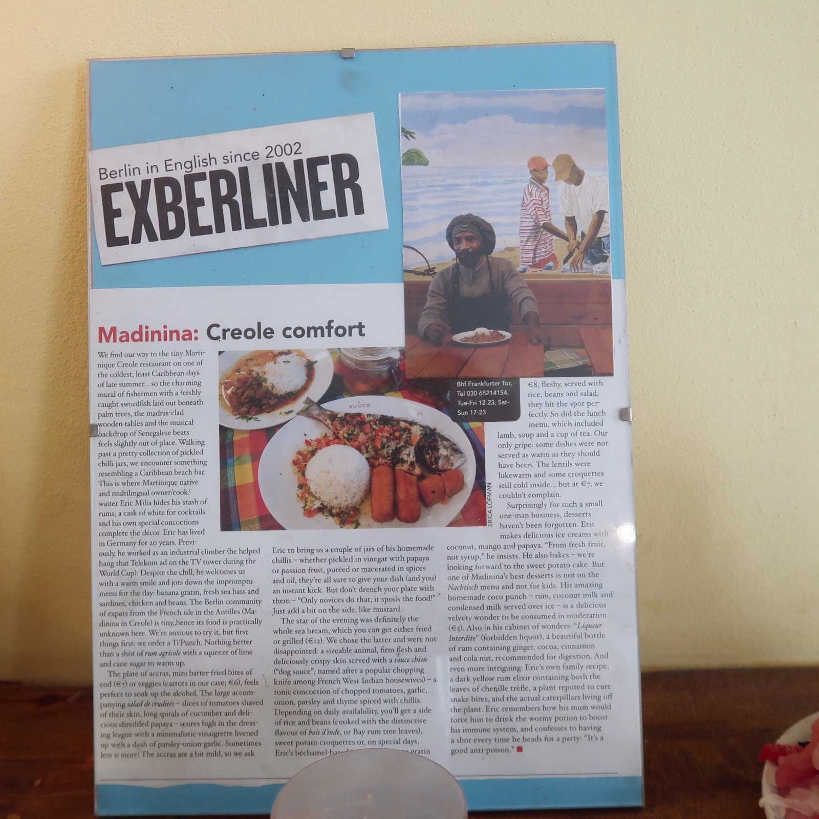 Le Madinina, c’est la Martinique. Je ne pourrais pas mieux décrire ce restaurant. Tout là-bas, me faire penser à chez moi. D’abord l’accueil. Le maître des lieux, Eric, est un rasta au sourire timide mais franc. Il y a beaucoup de douceur qui se dégage de ce Martiniquais expatrié depuis plus de 20 ans à Berlin. À travers sa cuisine, il reste néanmoins lié d’une des plus belles façons à son île. Le lieu est sans prétention, mais intimiste. On a l’impression d’être chez un ami pour le dîner.