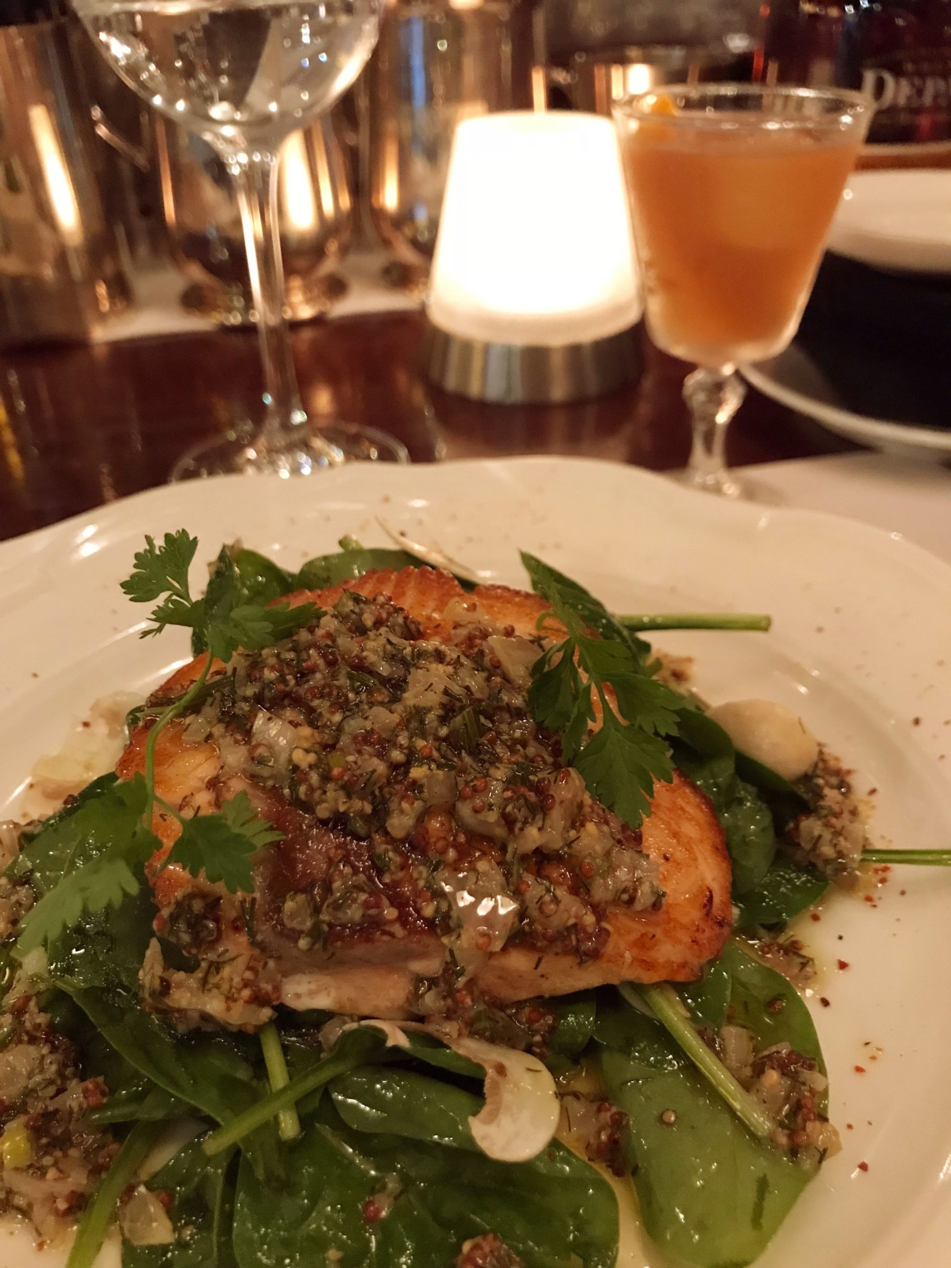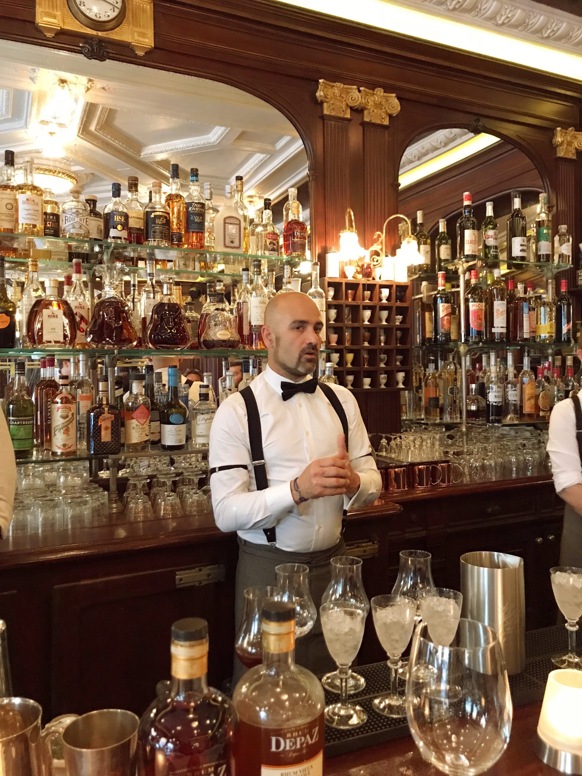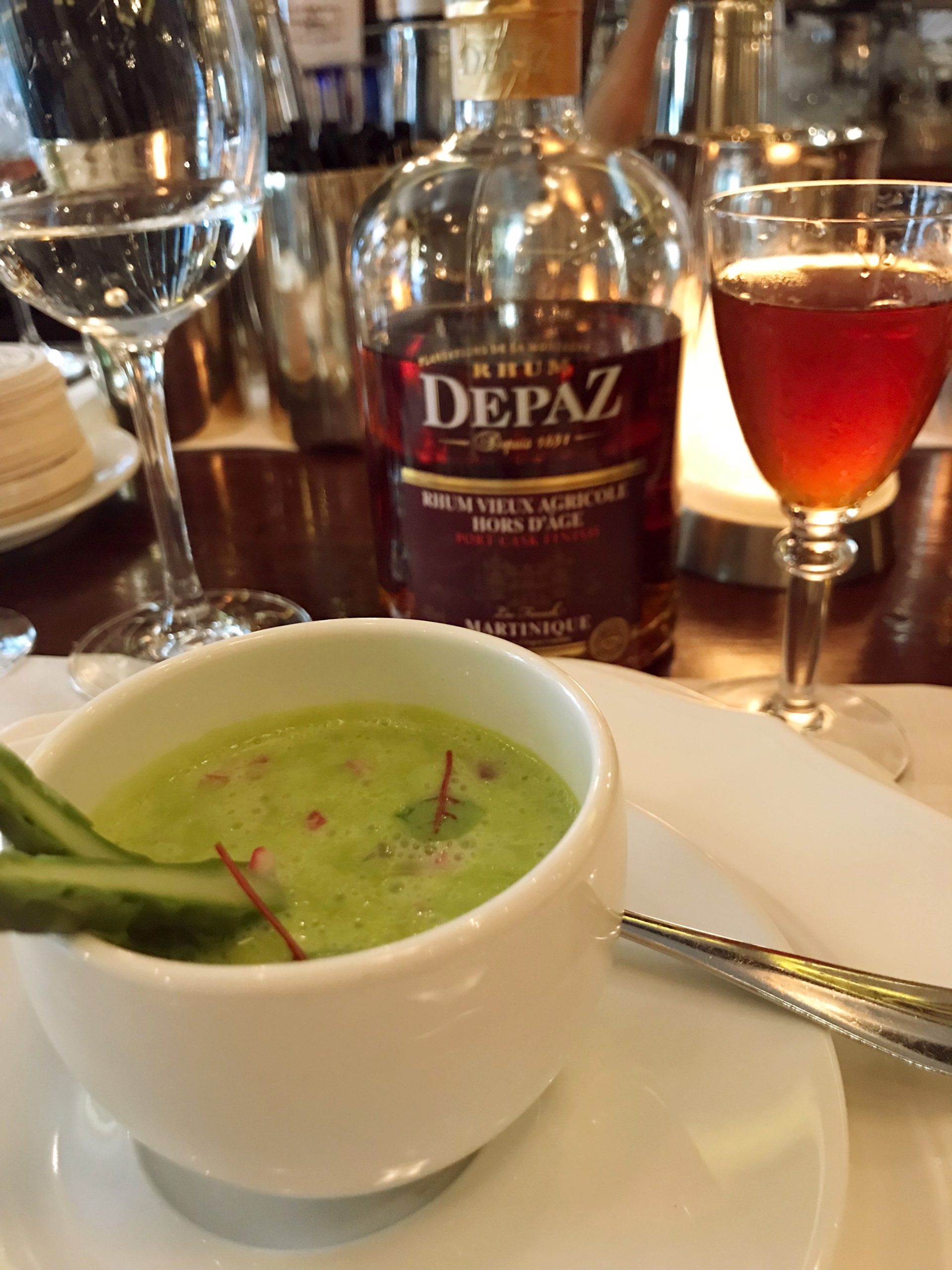Tous les jeudis, le Gallopin propose de déguster 4 accords/mets/ cocktails. Et ce jeudi, les rhums DEPAZ étaient à l’honneur. Pour commencer le chef, Mathieu Scherrer, nous a proposé un velouté de petits-pois avec une pointe d’asperge. Pour accompagner ce plat, Stan et Jill, au bar, nous ont offert un négroni revisité avec le Depaz hors d’âge finition porto. Nous avons poursuivi avec une pomme dauphine à la dorade, sublimée par un manhattan revisité avec un Depaz 2002. Des gambas sautées et sa brunoise de patate douce et fèves flambées à l’absinthe pour un cocktail dandy shym avec un Depaz rhum blanc. Une explosion de saveur a surpris tout le monde avec l’accord saumon pousse d’épinard sauce moutarde et son twist old fashion avec un Depaz plantation. Nous avons terminé ce sublime repas par un baba au rhum et son Depaz VSOP façon Tom et Jerry en cocktail.