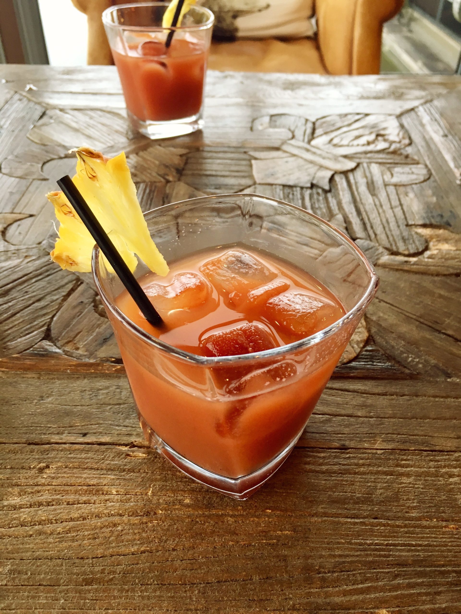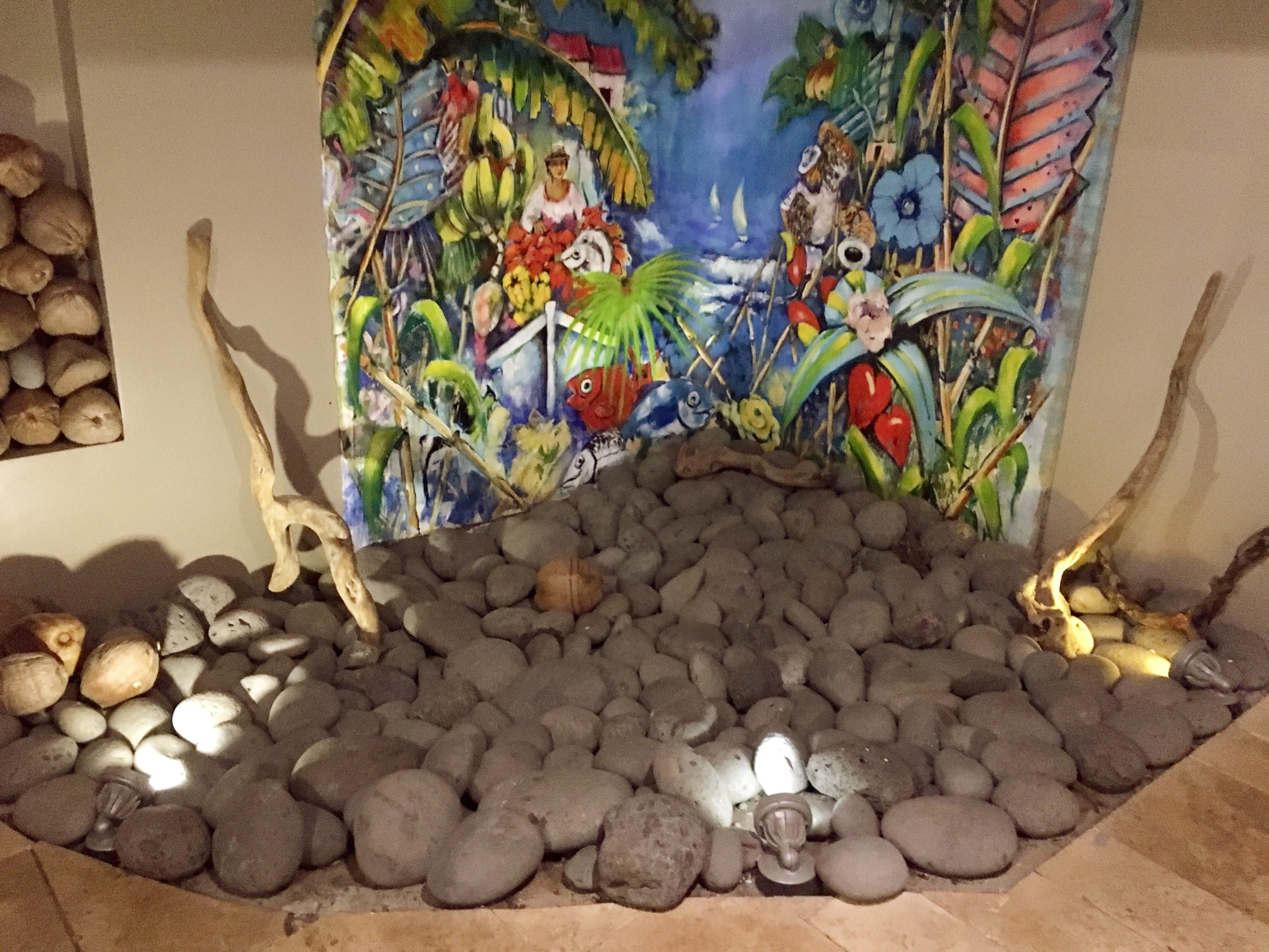 La maison nous offre un cocktail de bienvenue. Sans alcool pour le coup… Faudra reprendre autre-chose après alors! (l’abus d’alcool est dangereux pour la santé!). La nuit est en train de tomber et seules les quelques lumières et le feu de la cheminée éclairent la pièce à présent, malgré les fenêtres grâce auxquelles nous pouvons voir la ville de Sainte-Anne « by night » avec toutes ses petites lumières. La vue, comme le cadre, est prenante…