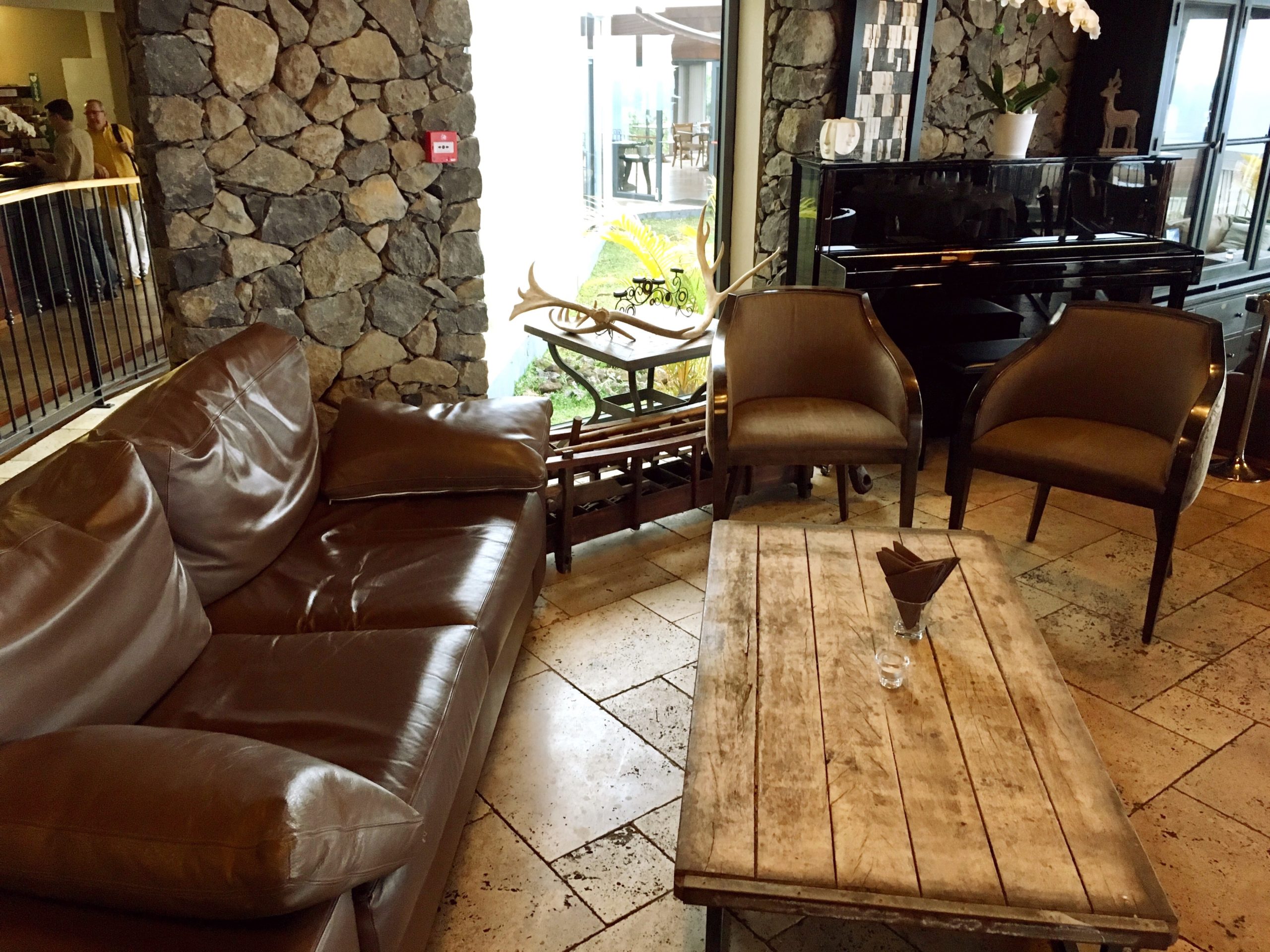 Après un moment de détente, je rejoins mon collègue et notre rendez-vous dans le grand salon qui sert également de salle d’accueil au restaurant de l’hôtel. L’endroit est magnifique, de grandes vitres remplacent les murs de la pièce qui a été construite et décorée telle une lodge sud-africaine. Nous avons une vue magnifique sur la ville de Sainte-Anne, sur l’océan indien, puis plus près, sur la piscine chauffée située à l’extérieur où quelques baigneurs tardifs piquent une tête avant le dîner. La déco est soignée, des sièges et canapés en cuir, une vieille bibliothèque, un bar, du mobilier en bois et au milieu de la pièce, une cheminée à feu ouvert, que le barman s’efforce à allumer pour indiquer l’ouverture du bar.