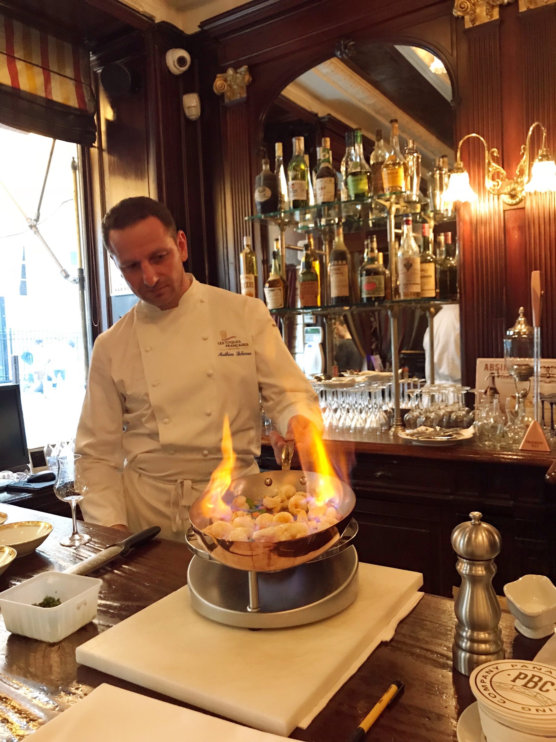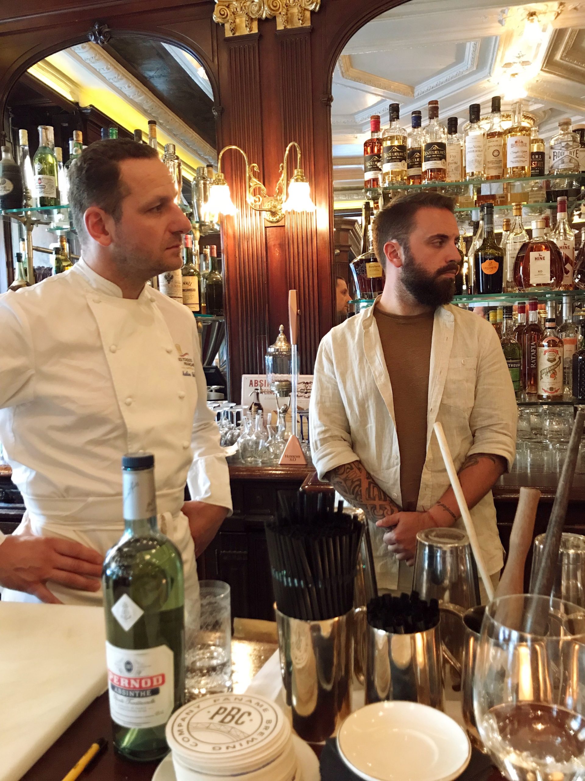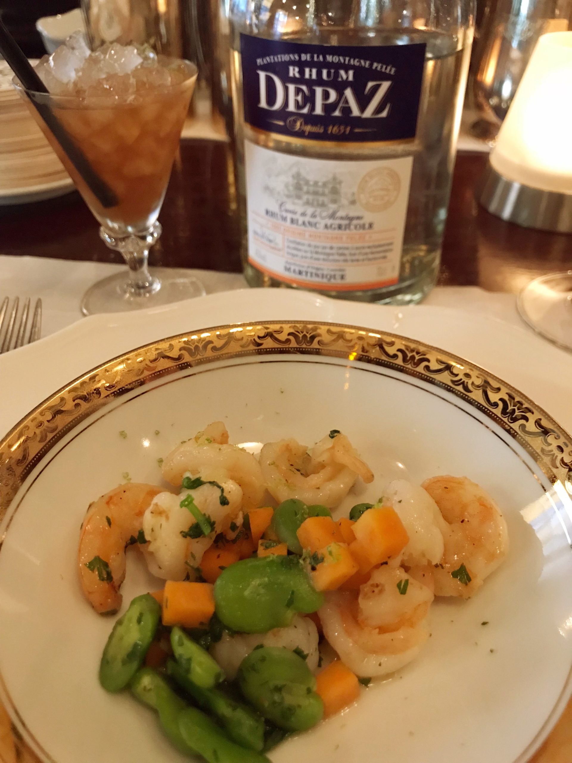 Every Thursday, the Gallopin proposes to taste 4 pairings of dishes with cocktails. And this Thursday, DEPAZ rums were in the spotlight. To start the chef, Mathieu Scherrer prepared a peas-soup with a hint of asparagus. To fit with this dish, Stan and Jill, the two bartenders, offered us a revisited Negroni prepared with some Depaz Hors-d’Age Port Cask Finish. We continued with a sea bream stuffed potato, sublimated by a Manhattan prepared with the Depaz Millésime 2002. Sautéed prawns and its sweet potato brunoise and absinthe flamed beans paired with a Dandy Shym cocktail prepared with the Depaz white rum – Cuvée de la Montagne. An explosion of flavor surprised everyone with the salmon spinach combination in mustard sauce and its Old Fashion prepared with the Depaz VO. We ended this wonderful meal with a « Baba au rhum » and a Depaz VSOP Tom and Jerry cocktail.